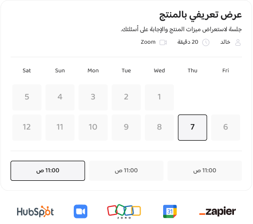 أنشئ روابط Google Meet & Zoom تلقائياً مع كل حجز. ريح رأسك من إرسال الروابط اليدوية، وخل عميلك ينضم بضغطة زر.
